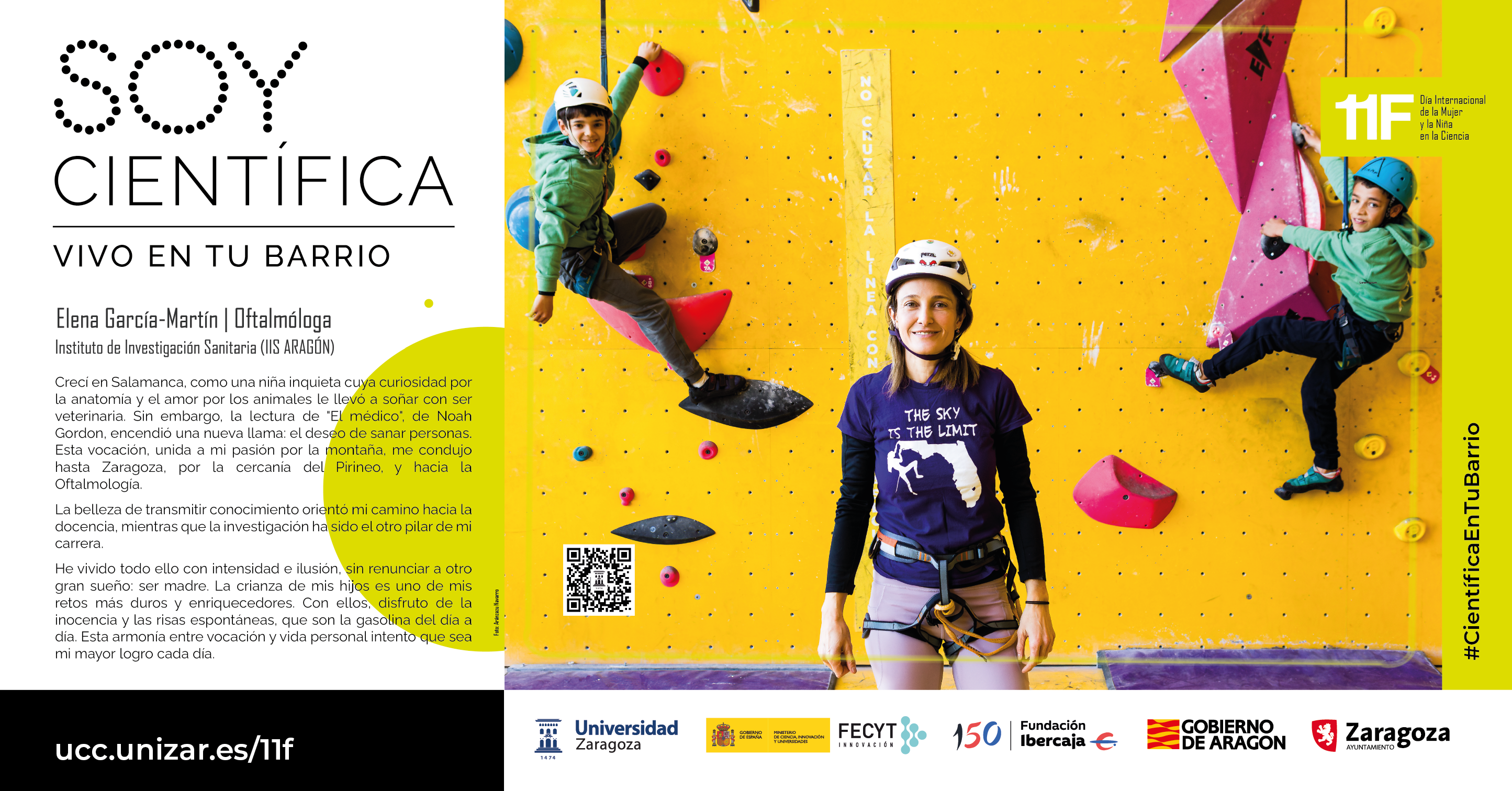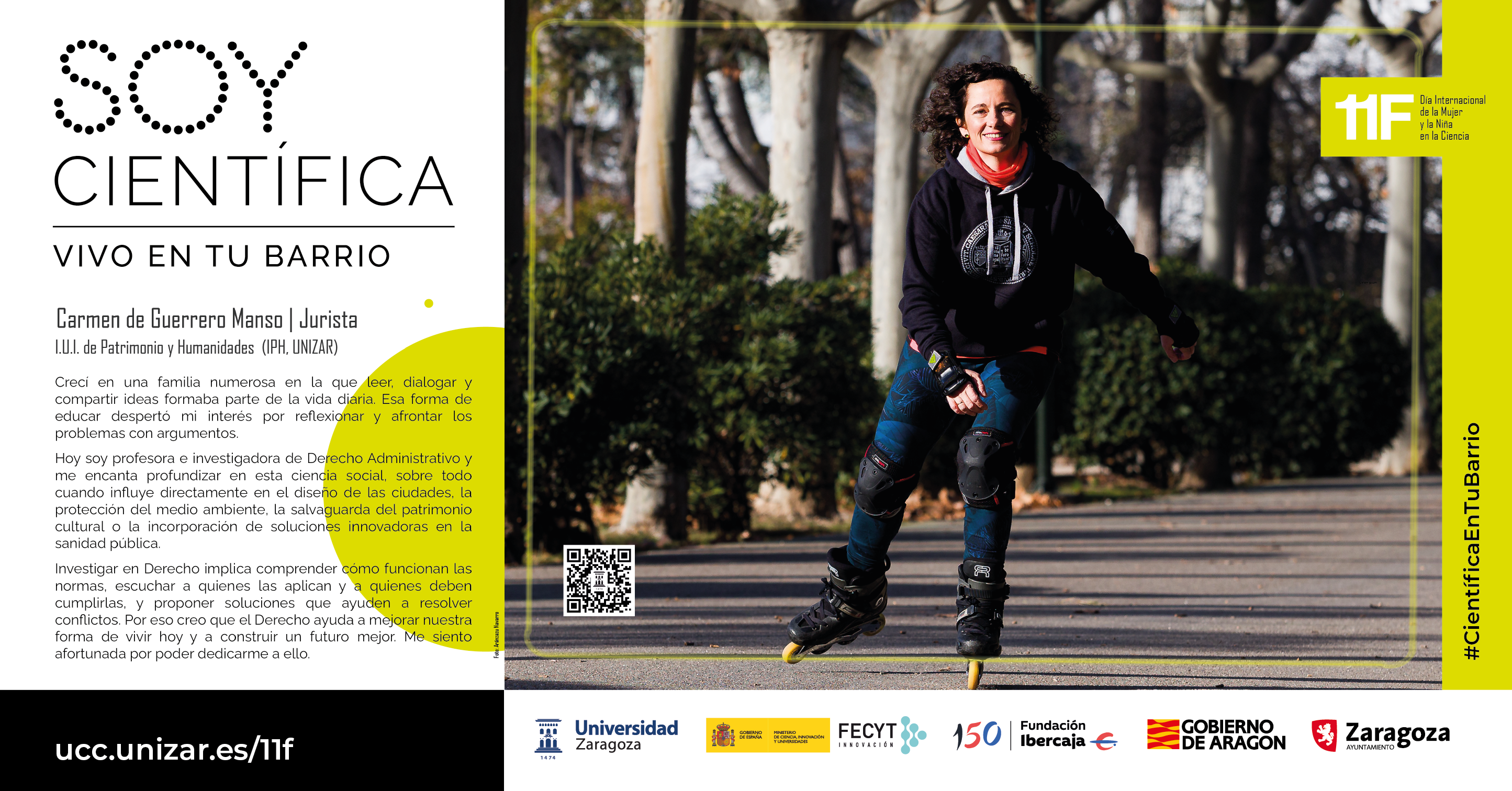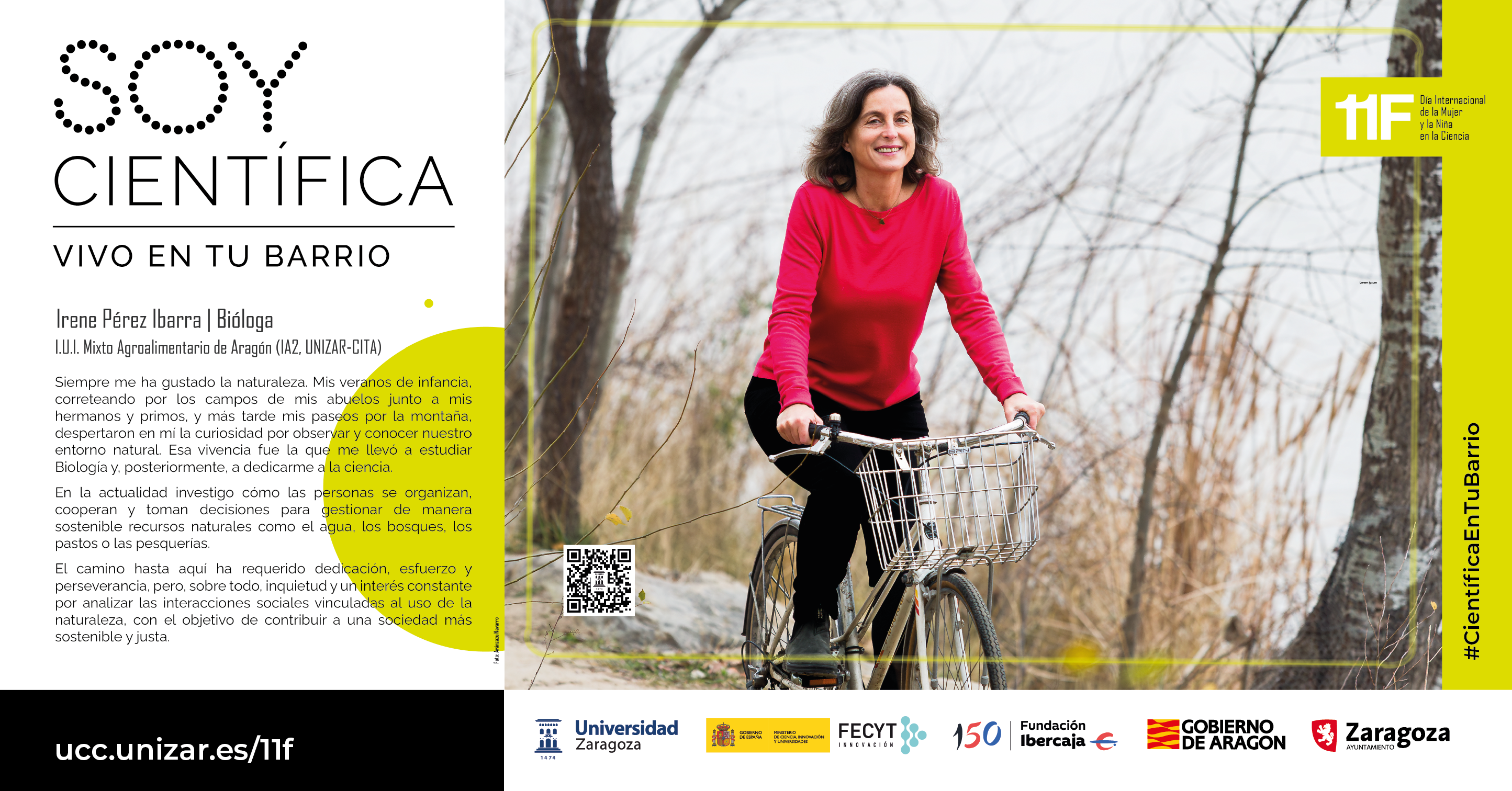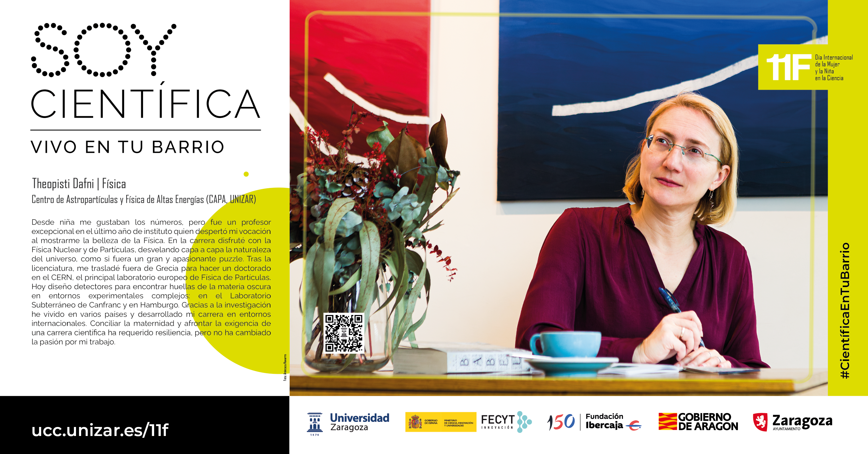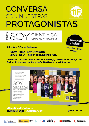 Por sexto año consecutivo, la Universidad de Zaragoza organiza, en conmemoración del 11F (Día Internacional de la Mujer y la Niña en la Ciencia), la campaña “Soy Científica. Vivo en tu barrio”, una exposición en la calle, con fotografías de gran formato de 12 investigadoras, tomadas fuera del laboratorio y realizando actividades cotidianas, para ofrecer referentes reales y cercanos a las niñas y adolescentes.