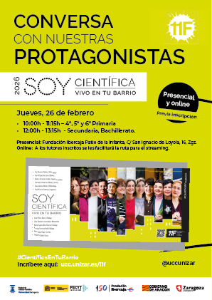 Por sexto año consecutivo, la Universidad de Zaragoza organiza, en conmemoración del 11F (Día Internacional de la Mujer y la Niña en la Ciencia), la campaña “Soy Científica. Vivo en tu barrio”, una exposición en la calle, con fotografías de gran formato de 12 investigadoras, tomadas fuera del laboratorio y realizando actividades cotidianas, para ofrecer referentes reales y cercanos a las niñas y adolescentes.