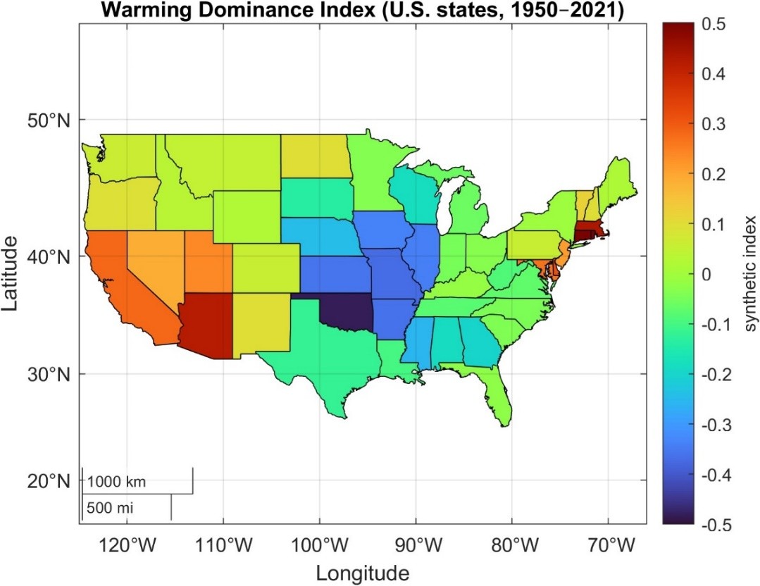 El estudio también establece un ranking de los estados que experimentan un calentamiento más intenso (lo que los autores denominan "dominancia fuerte"). La lista la encabezan Rhode Island, Arizona, Connecticut, Massachusetts y California. Estos estados actúan como "líderes" del calentamiento, registrando incrementos de temperatura más severos que el resto del país.