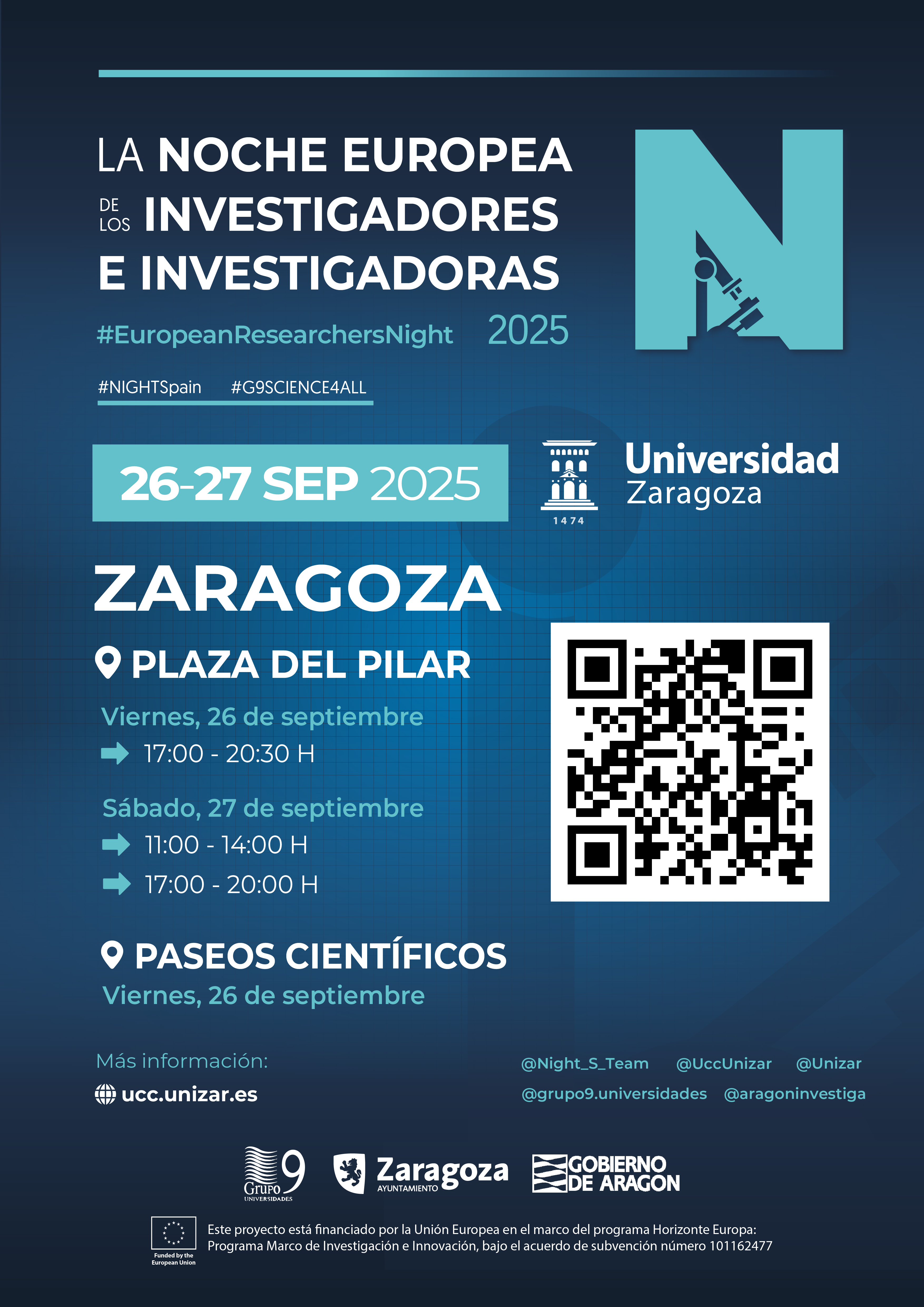 En la Universidad de Zaragoza, la Noche de los Investigadores e Investigadoras está liderada por el Vicerrectorado de Política Científica, y organizada por la Unidad de Cultura Científica (UCC) y la Oficina de Proyectos Europeos (OPE). Se celebra dentro del proyecto europeo G9-SCIENCE4ALL del Grupo 9 de Universidades, financiado por la Comisión Europea bajo las Acciones Marie Skodowska-Curie (MSCA), dentro del programa Horizonte Europa: Programa Marco de Investigación e Innovación, bajo el acuerdo de subvención nº 101162477.