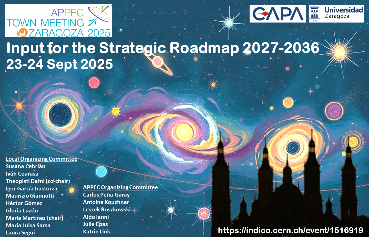 (Zaragoza, lunes, 22 de septiembre de 2025). Zaragoza se convierte esta semana en la capital europea de la Física de Astropartículas. Más de 100 expertos europeos se reúnen desde mañana martes en el Paraninfo de la Universidad de Zaragoza para diseñar la hoja de ruta europea en este ámbito, promovido por la AstroParticle Physics European Consortium (APPEC), en un encuentro organizado por el Instituto Universitario de Investigación Centro de Astropartículas y Física de Altas Energías (CAPA-Unizar).