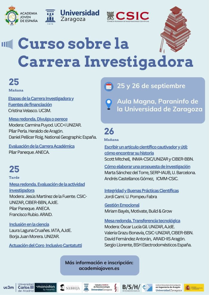 (Zaragoza, martes 16 de septiembre de 2025). La Academia Joven de España, en colaboración con la Universidad de Zaragoza y el CSIC, organiza la IV edición del Curso de la Carrera Investigadora el 25 y 26 de septiembre, gratuito, que se desarrollará de forma presencial en el Paraninfo así como online. (La inscripción es necesaria en ambos casos: Formulario de inscripción).